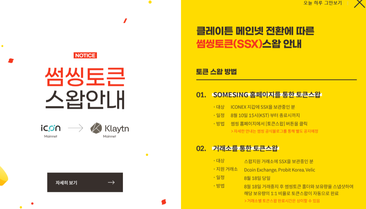 최근에 SOMESING 토큰이 카카오의 자회사인 그라운드X의 플랫폼인 클레이튼 메인넷으로 전환되었다고 하네요!