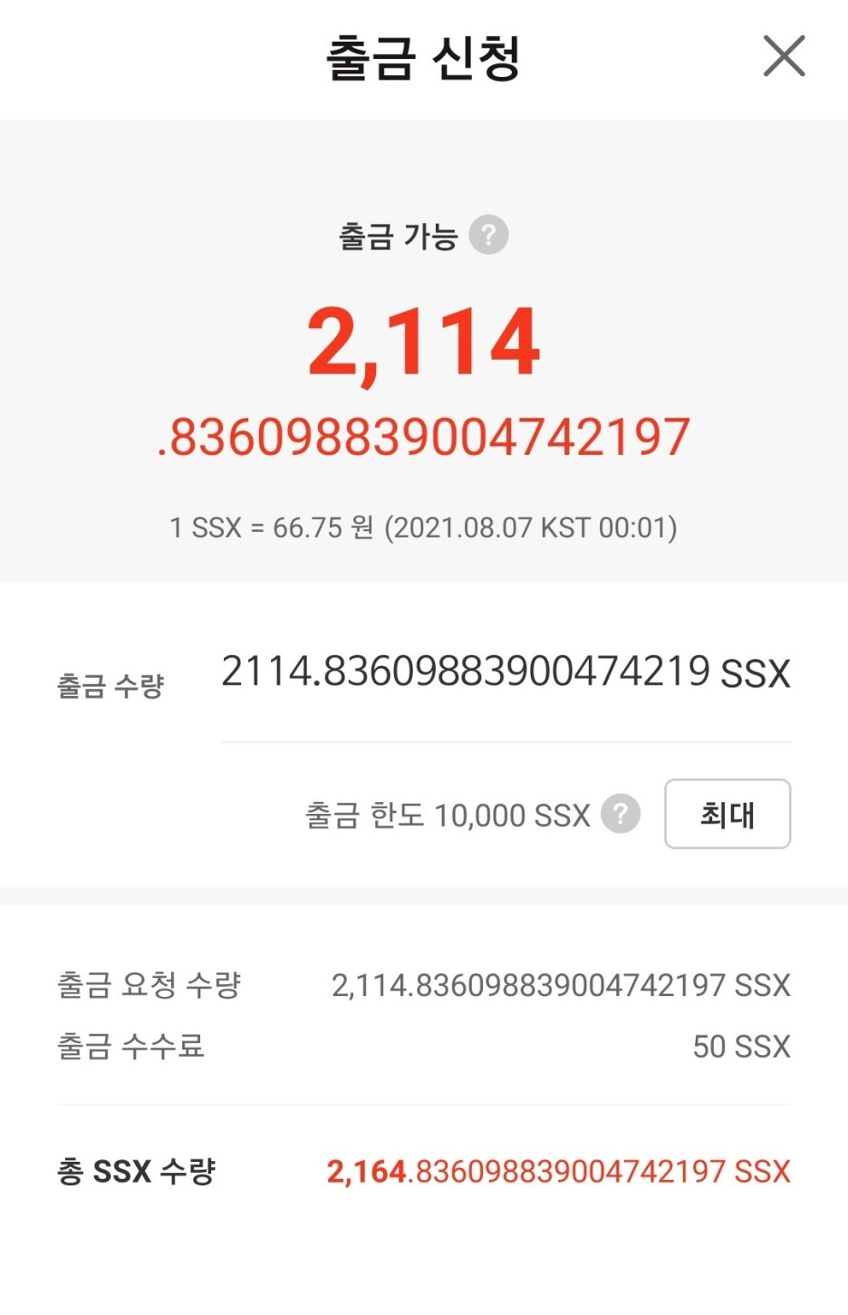 썸씽 구매시 200SSX 송금 수수료가 있다는 거 참고하시어 썸씽 앱내 출금수수료 50까지 포함하시어 최소 250 수수료로 나간다는 점 주의하여 출금하세요~~~